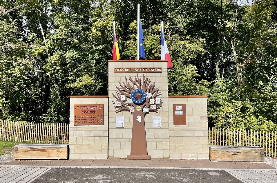 Il s’agit d’un arbre métallique muni de 2 compteurs, celui du haut affiche le nombre de jours de paix depuis le 8 mai 1945 et celui du bas, relié à une main découpée dans le tronc, comptabilise le nombre de personnes y ayant posé leur main en signe d’adhésion à cette idée. Vous êtes invité à y mettre la vôtre lors de votre passage. L’arbre symbolise l’amitié entre les peuples et la chance de vivre en paix dans l’Union Européenne depuis plus de 29 000 jours. Les racines représentent nos différentes origines, le tronc le rassemblement des bonnes volontés et la convergence des énergies, la couronne les projets communs bâtis ensemble.