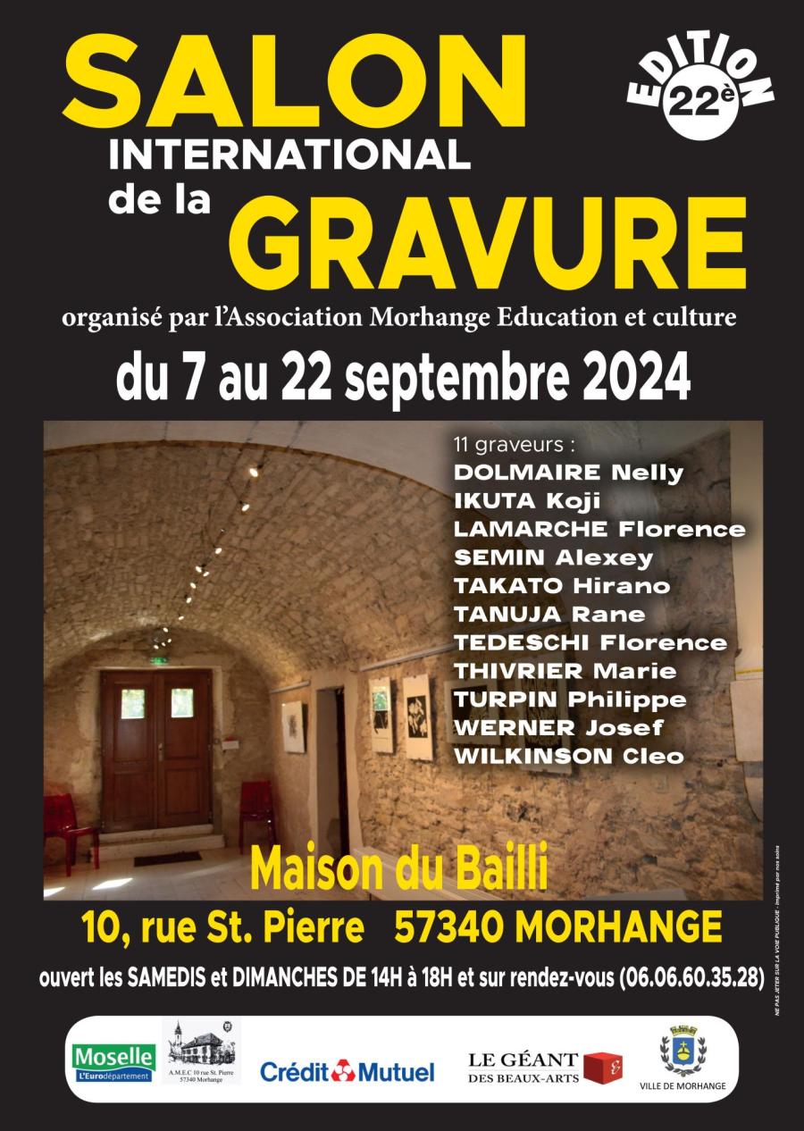 22ème salon internationale de la gravure Samedis et dimanches de 14h à 18h ou sur RDV. Entrée libre. Infos au 06 06 60 35 28. + Ajouter à mon Agenda Google + iCal / Outlook export Date 07 Sep 2024 Expiré! Heure 14 h 00 min - 18 h 00 min Lieu La Maison du Bailli Rue Saint-Pierre, 57340 Morhange Organisateur Association Morhange Education et Culture Partagez cet événement