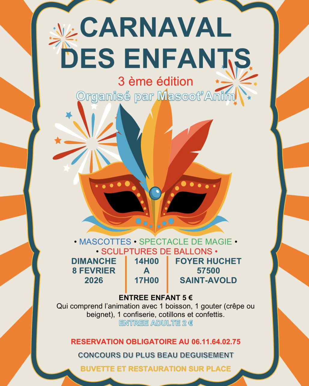 3ème carnaval des enfants Mascottes, spectacle de magie, sculptures de ballons. Entrée : 5€/adulte, et 2€/enfant. Réservation au 06 11 64 02 75. + Ajouter à mon Agenda Google + iCal / Outlook export Date 08 Fév 2026 Expiré! Heure 14 h 00 min - 17 h 00 min Lieu Foyer Huchet Saint-Avold 1 Av. de l'Étang, 57500 Saint-Avold Organisateur Mascot'Anim Téléphone 06 11 64 02 75 Email mascot.anim@gmail.com Partagez cet événement