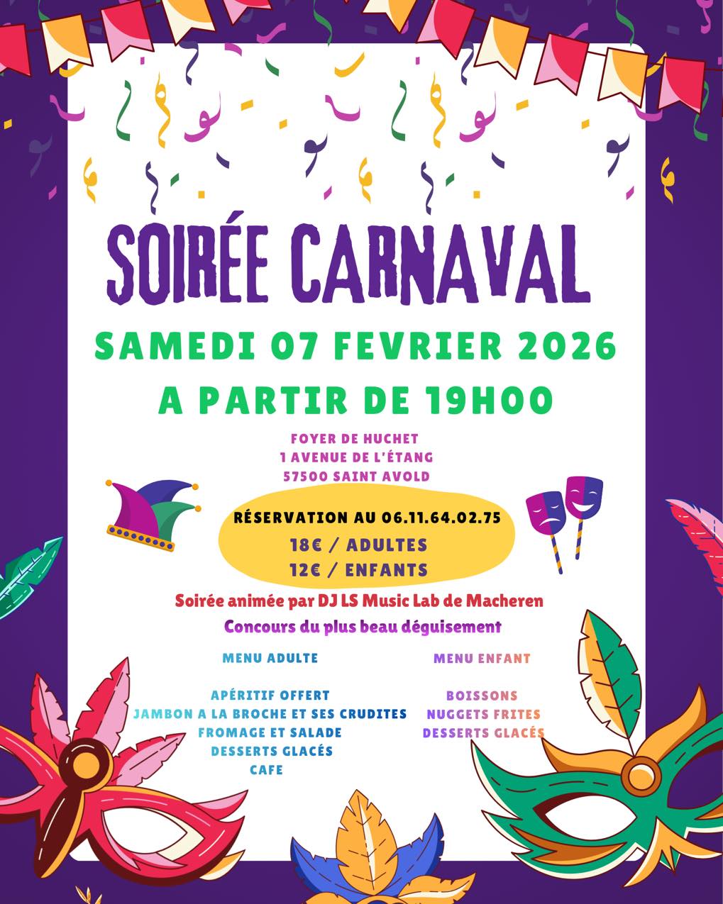 ANNULÉE soirée carnaval ANNULÉE Soirée animée par DJ LS Music Lab de Macheren. Repas : 18€/adulte, et 12€/enfant. Sur réservation au 06 11 64 02 75. + Ajouter à mon Agenda Google + iCal / Outlook export Date 07 Fév 2026 Expiré! Heure 19 h 00 min Lieu Foyer HUCHET Organisateur Mascot'Anim Téléphone 06 11 64 02 75 Email mascot.anim@gmail.com Partagez cet événement