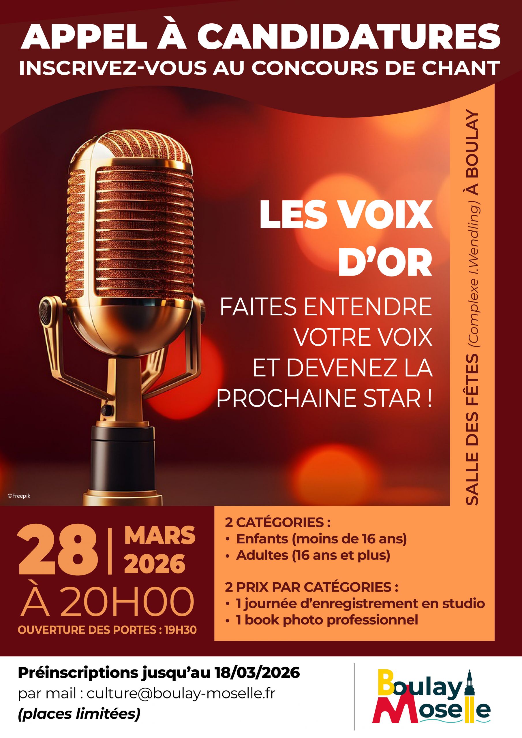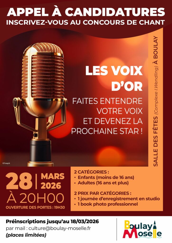 5 ème édition Les Voix d’Or + Ajouter à mon Agenda Google + iCal / Outlook export Date 28 Mar 2026 Heure 20 h 00 min - 20 h 00 min Lieu Salle des fêtes de Boulay 1 route de Bouzonville 57220 Boulay Moselle Partagez cet événement