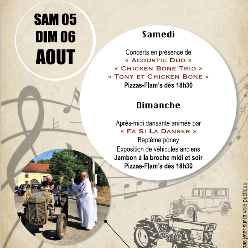 Après-midi dansante animée par « FA SI LA DANSER », Baptême poney. Exposition de véhicules anciens. Jambon à la broche midi et soir Pizzas-Flam’s dès 18h30.