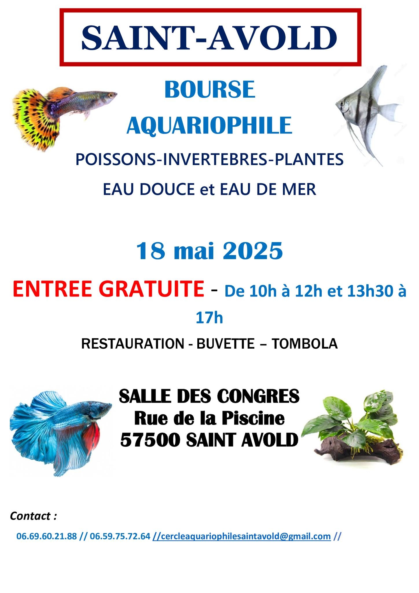 Bourse aquariophile + Ajouter à mon Agenda Google + iCal / Outlook export Date 18 Mai 2025 Expiré! Heure 13 h 30 min - 17 h 00 min Lieu Salle des Congrès Rue de la Piscine 57500 SAINT-AVOLD Organisateur Cercle aquariophile de Saint-Avold Partagez cet événement