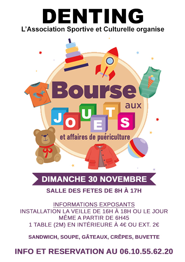 Bourse aux jouets + Add to Google Calendar + iCal / Outlook export Date 30 Nov 2025 Expired! Time 8 h 00 min - 18 h 00 min Location Salle des Fêtes de Denting Organizer Association socio-culturelle Denting Share this event