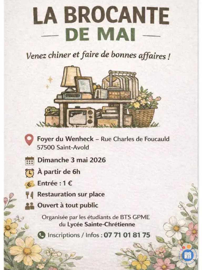 Brocante de mai organisée par les étudiants de BTS GPME du lycée Sainte-Chrétienne. Informations au 07 71 01 81 75. + Ajouter à mon Agenda Google + iCal / Outlook export Date 03 Mai 2026 Heure 6 h 00 min Lieu Foyer du Wenheck rue Charles de Foucauld / 57500 Partagez cet événement