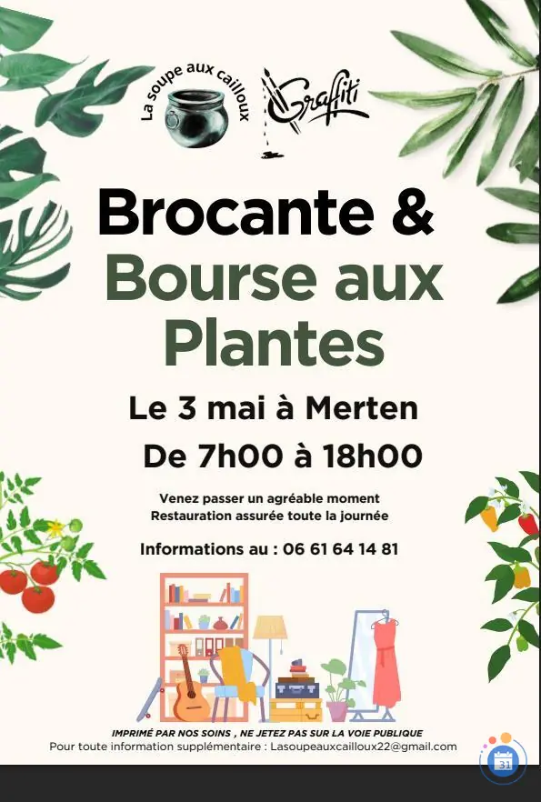 Brocante et bourse aux plantes + Ajouter à mon Agenda Google + iCal / Outlook export Date 03 Mai 2026 Heure 7 h 00 min - 18 h 00 min Lieu Place du château de Merten 57550 - MERTEN Organisateur La soupe aux cailloux de Merten Partagez cet événement