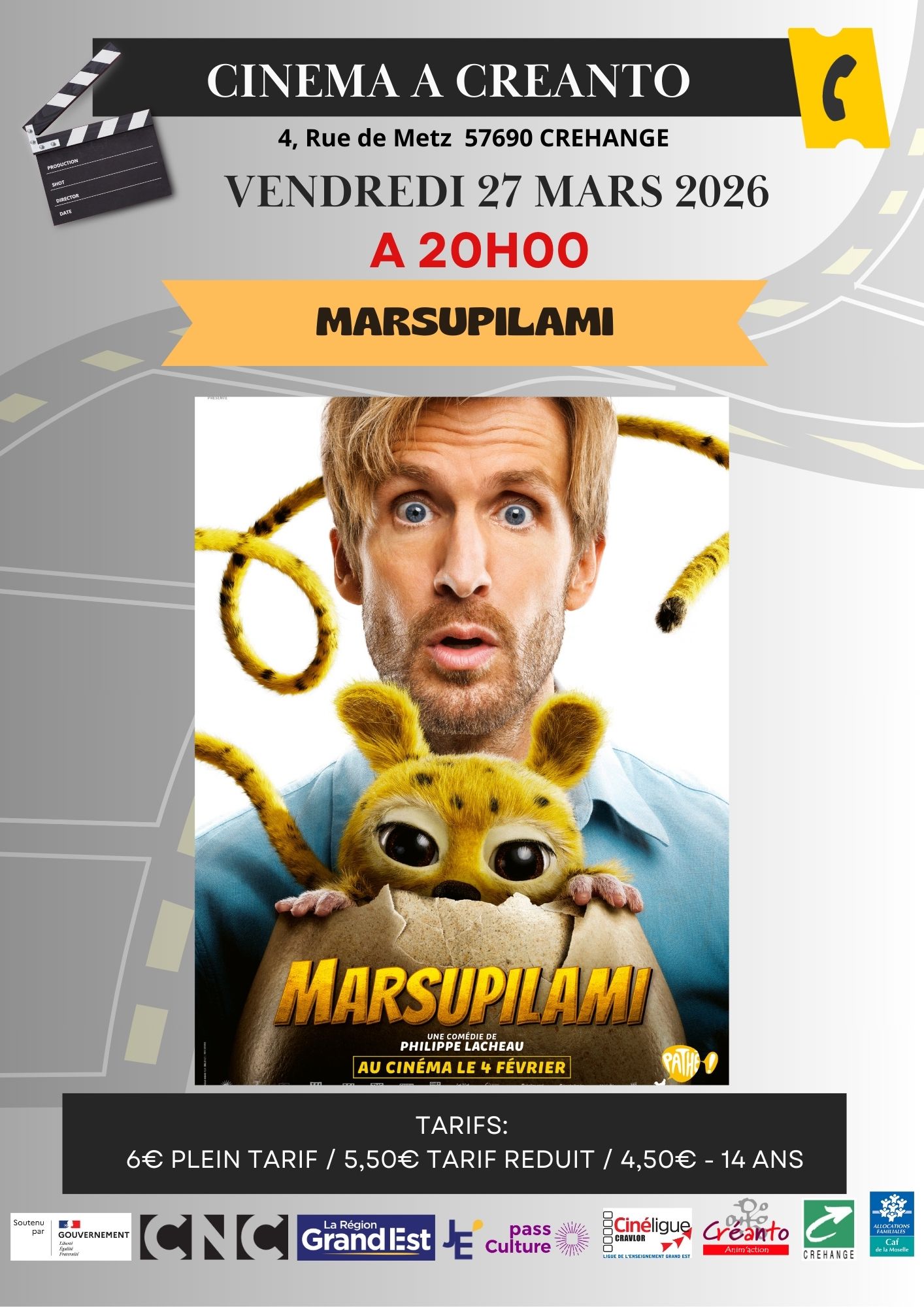 Cinéma : Marsupilami Tarifs : plein : 6€, réduit : 5,50€ et – de 14 ans : 4,50€. Informations au 03 87 94 26 26. + zum Google Calendar hinzufügen + iCal / Outlook export Datum 27 März 2026 Uhrzeit 20 h 00 min Ort Centre social Créanto Veranstalter Créanto Anim'Action Diese Veranstaltung teilen