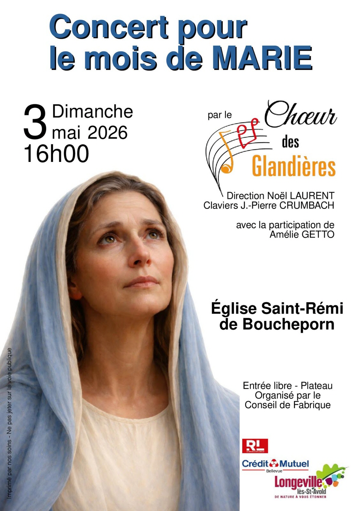 Concert pour le mois de Marie + Ajouter à mon Agenda Google + iCal / Outlook export Date 03 Mai 2026 Heure 16 h 00 min Lieu Église Saint-Rémi de Boucheporn 57220 BOUCHEPORN Organisateur Choeur des Glandières de Longeville-lès-saint-avold Partagez cet événement