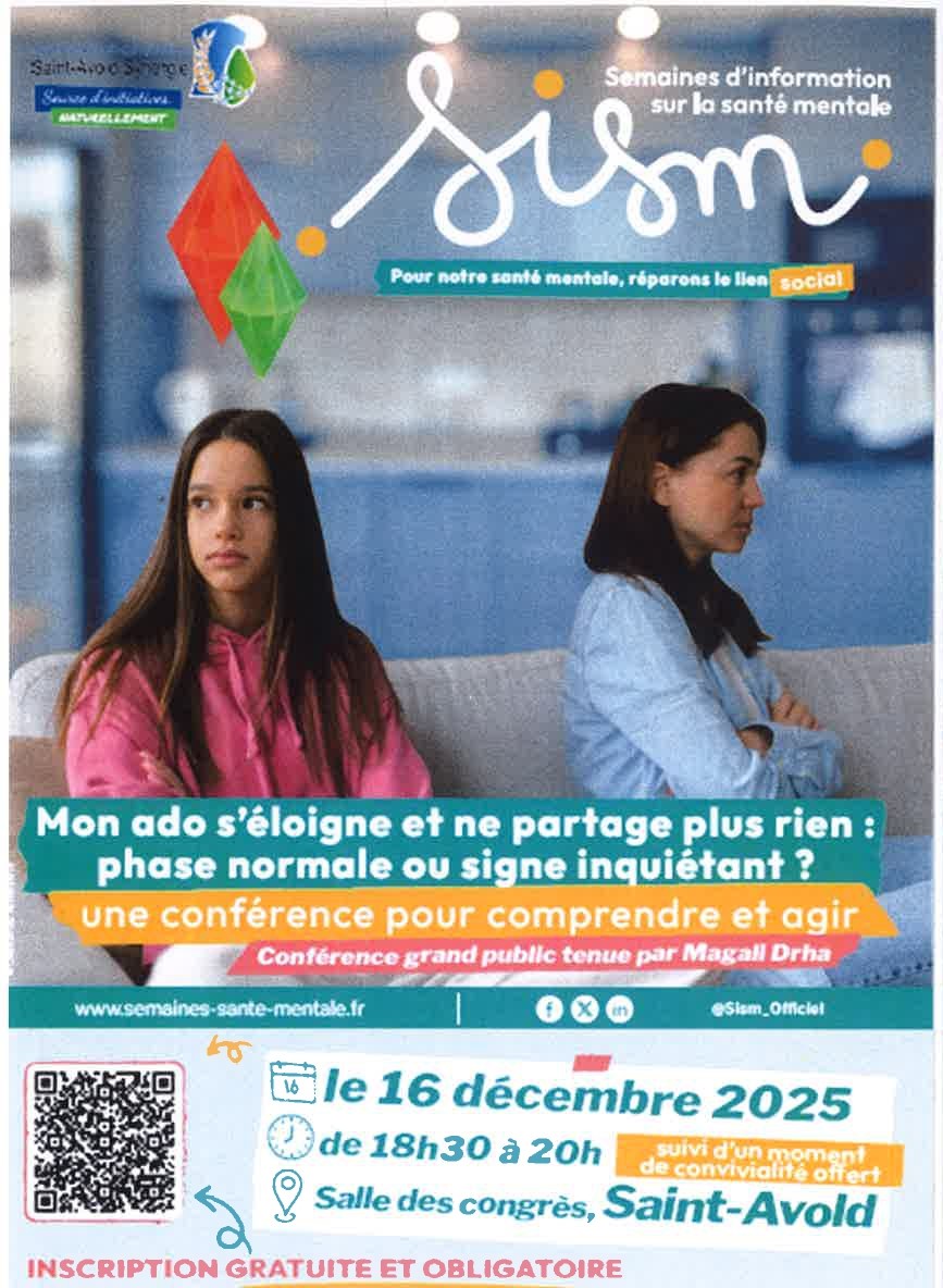 Conférence : Mon ado s’éloigne et ne partage plus rien : phase normale ou signe inquiétant ? + Ajouter à mon Agenda Google + iCal / Outlook export Date 16 Déc 2025 Heure 18 h 30 min Lieu salle des congrès Saint-avold Rue de la Piscine, 57500 Saint-Avold Organisateur CASAS Partagez cet événement
