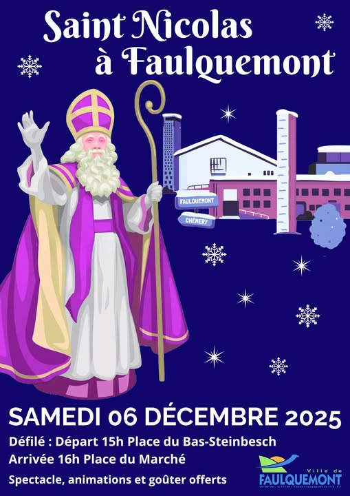 Défilé de la Saint-Nicolas Informations au 03 87 89 69 95. + Ajouter à mon Agenda Google + iCal / Outlook export Date 06 Déc 2025 Heure 14 h 30 min Lieu Faulquemont Faulquemont Organisateur Mairie de Faulquemont Partagez cet événement
