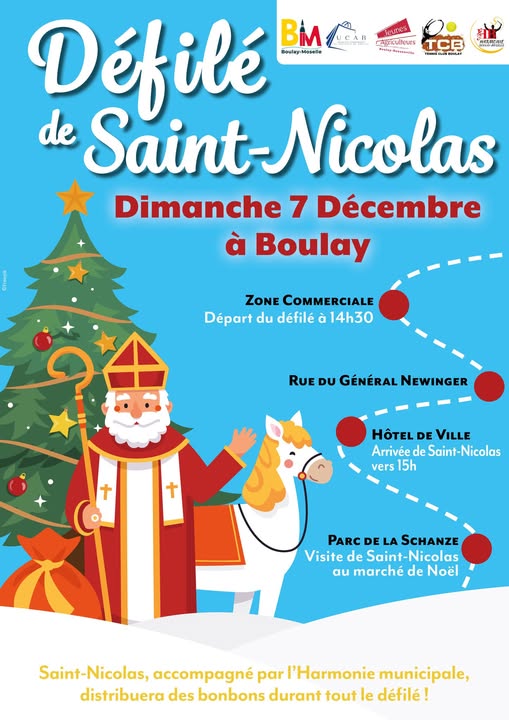 Défilé de la Saint-Nicolas Informations au 03 87 79 18 31. + Ajouter à mon Agenda Google + iCal / Outlook export Date 07 Déc 2025 Lieu Centre-ville de Boulay 57220 Organisateur Ville de Boulay-Moselle Partagez cet événement