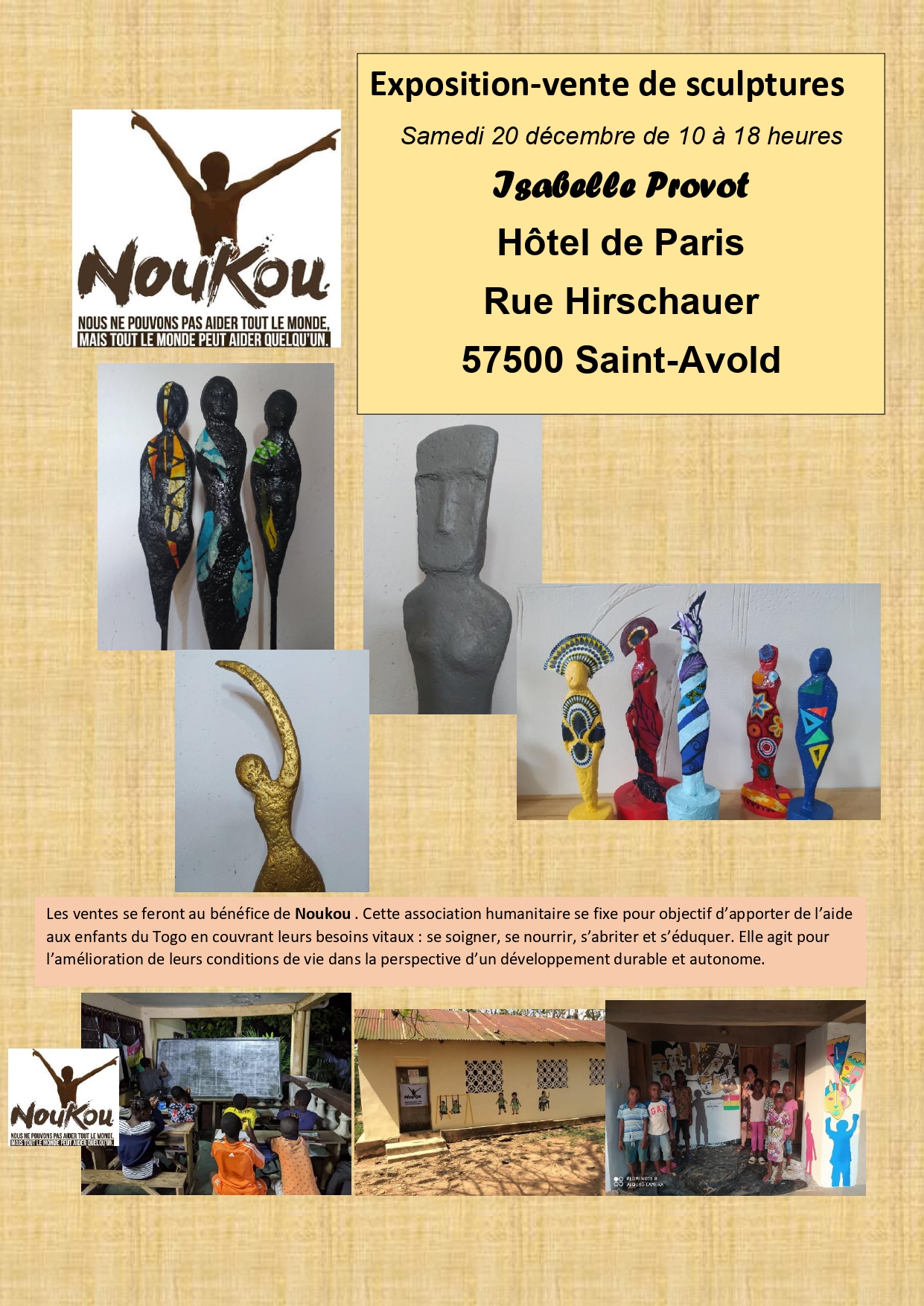 Exposition-vente de sculptures Exposition et vente de sculpture d’Isabelle Provot. Les ventes se feront au bénéfice de l’association Noukou. + zum Google Calendar hinzufügen + iCal / Outlook export Datum 20 Dez. 2025 Uhrzeit 10 h 00 min - 18 h 00 min Ort Hôtel de Paris Veranstalter Unkategorisiert Diese Veranstaltung teilen