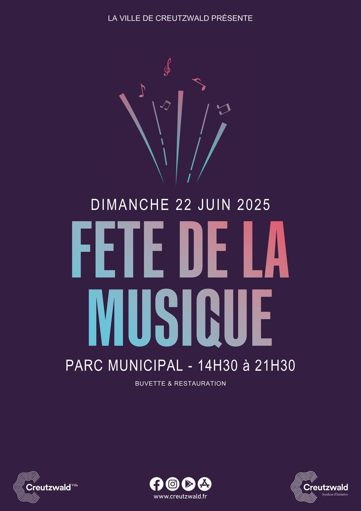Fête de la musique à CREUTZWALD Profitez du magnifique cadre verdoyant du plan d’eau pour écouter de la musique, danser, mais également vous restaurer. Découvrez le programme des concerts qui se dérouleront sur deux scènes : 𝗗𝗲 𝟭𝟰𝗵𝟯𝟬 𝗮̀ 𝟭𝟲𝗵𝟯𝟬 : 𝗛𝗜𝗚𝗪𝗔𝗬 𝗦𝗧𝗔𝗧𝗜𝗢𝗡 (𝘊𝘰𝘶𝘯𝘵𝘳𝘺-𝘳𝘰𝘤𝘬) 𝗗𝗲 𝟭𝟲𝗵𝟯𝟬 𝗮̀ 𝟭𝟳𝗵𝟯𝟬 : 𝗦𝗛𝗢𝗪 𝗣𝗔𝗥𝗔𝗗𝗘 𝗗𝗘 𝗖𝗥𝗘𝗨𝗧𝗭𝗪𝗔𝗟𝗗 𝗗𝗲 𝟭𝟳𝗵𝟯𝟬 𝗮̀ 𝟭𝟵𝗵𝟯𝟬 : 𝗥𝗢𝗖𝗞 𝗥𝗘𝗡𝗗𝗘𝗭-𝗩𝗢𝗨𝗦 (𝘙𝘰𝘤𝘬) 𝗗𝗲 𝟭𝟵𝗵𝟯𝟬 𝗮̀ 𝟮𝟭𝗵𝟯𝟬 : 𝗘𝗩𝗘𝗡𝗧𝗛𝗜𝗦 (𝘝𝘢𝘳𝘪𝘦́𝘵𝘦́𝘴 𝘐𝘯𝘵𝘦𝘳𝘯𝘢𝘵𝘪𝘰𝘯𝘢𝘭𝘦𝘴) 𝗕𝘂𝘃𝗲𝘁𝘁𝗲 𝗲𝘁 𝗿𝗲𝘀𝘁𝗮𝘂𝗿𝗮𝘁𝗶𝗼𝗻 𝗮𝘃𝗲𝗰 𝗹𝗲 𝗝𝘂𝗱𝗼 𝗖𝗹𝘂𝗯 : 𝗴𝗿𝗶𝗹𝗹𝗮𝗱𝗲𝘀, 𝗰𝗿𝗲̂𝗽𝗲𝘀, 𝗯𝗼𝗶𝘀𝘀𝗼𝗻𝘀 𝗳𝗿𝗮𝗶̂𝗰𝗵𝗲𝘀 + zum Google Calendar hinzufügen + iCal / Outlook export Datum 22 Juni 2025 Expired! Uhrzeit 14 h 30 min - 21 h 30 min Ort Plan d’eau de Creutzwald Veranstalter La Ville de Creutzwald et le Syndicat d'Initiative Phone 03 87 81 89 89 Diese Veranstaltung teilen
