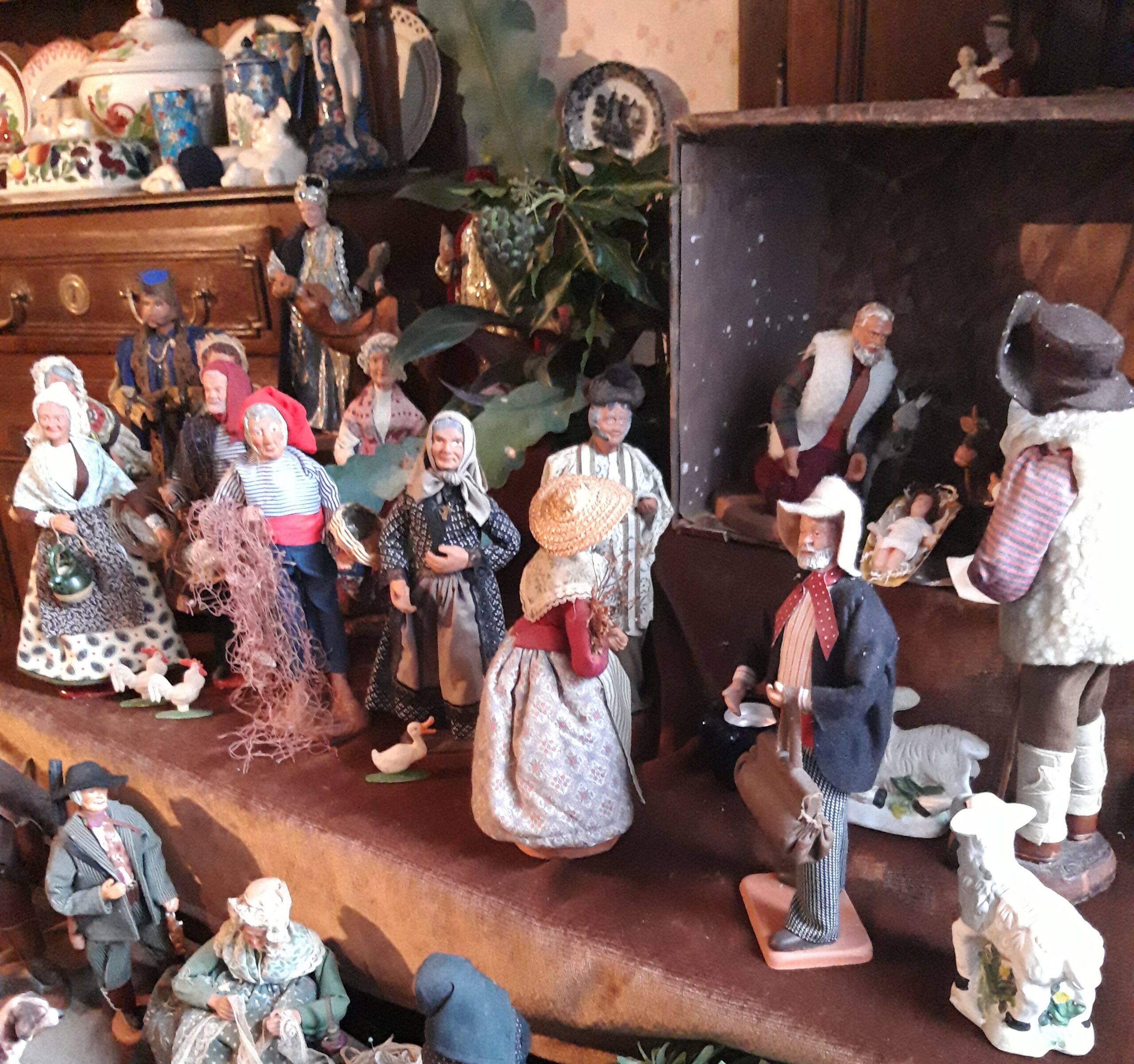 Mme Marie-Rose Stallknecht vous accueille dans sa maison aux allures de musée. Dans l’entrée, ancienne crèche de l’église paroissiale d’Odenhoven. Dans la pièce voûtée du XVème siècle, plusieurs crèches du Pays de Nied, sur la cheminée une collection d’anges et de bergers, des crèches en cire, terre cuite, bois, papier… Dans le Stuff, 4 crèches provençales de tailles différentes avec des personnages en terre cuite. Les vêtements et accessoires sont fabriqués sur mesure à la main. Les santons sont de véritables objets d’art.