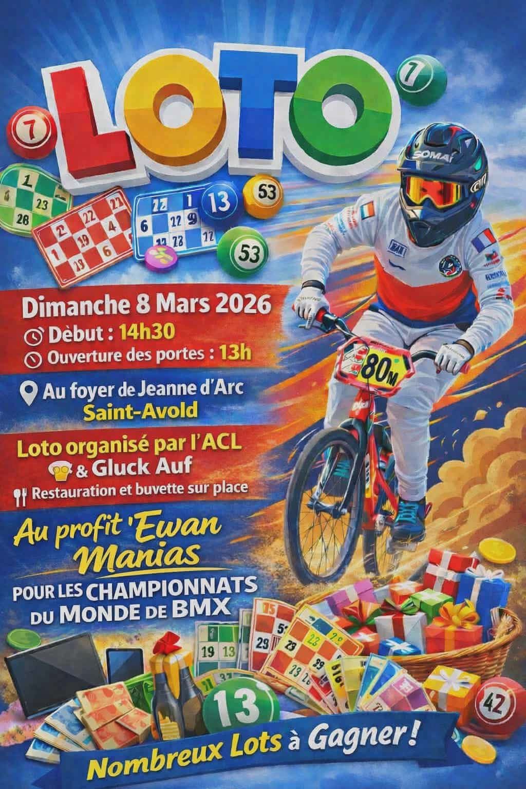 Loto Informations au 06 80 83 53 25. + Ajouter à mon Agenda Google + iCal / Outlook export Date 08 Mar 2026 Heure 14 h 30 min Lieu Foyer de Jeanne d’Arc Organisateur ACL Jeanne d'Arc Saint-Avold Téléphone 06 80 83 53 25 Partagez cet événement