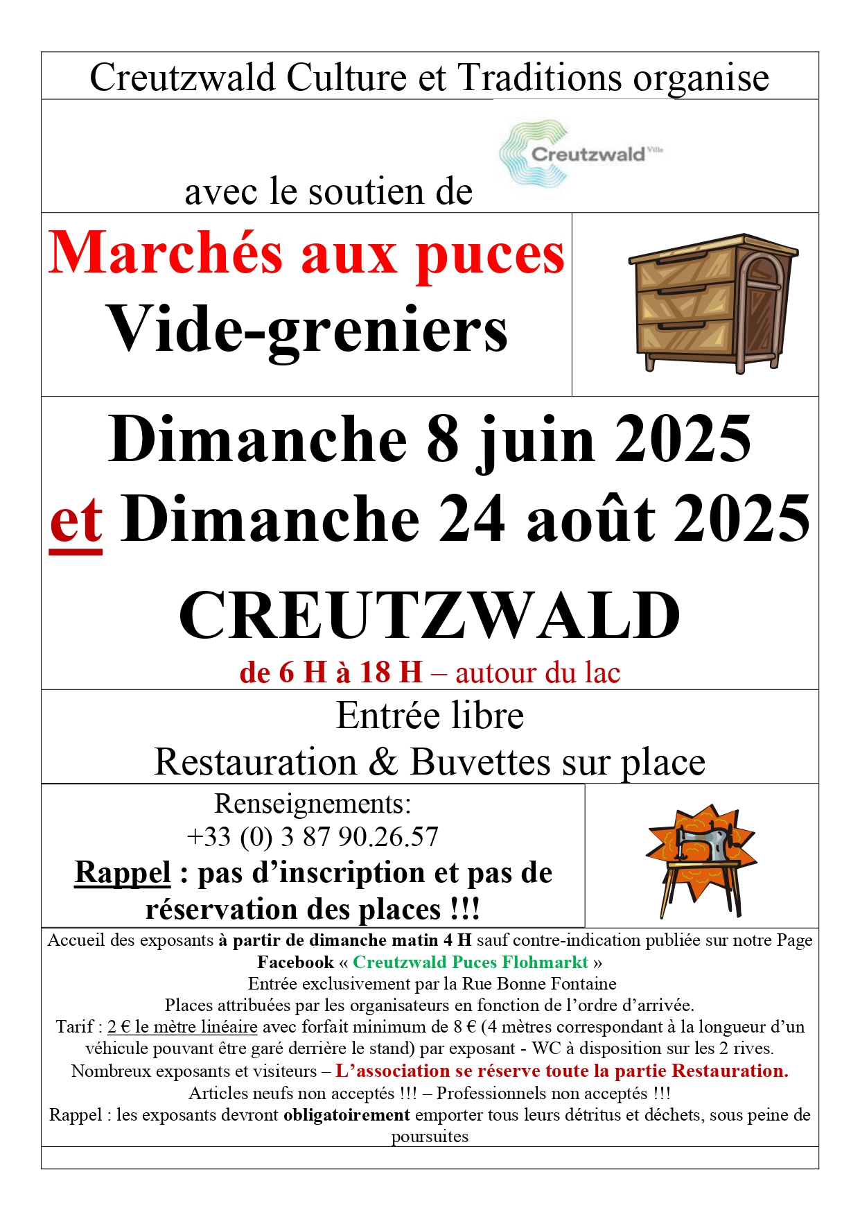 Informations au 03 87 90 26 57 ou sur Facebook : Creutzwald Puces Flohmarkt.