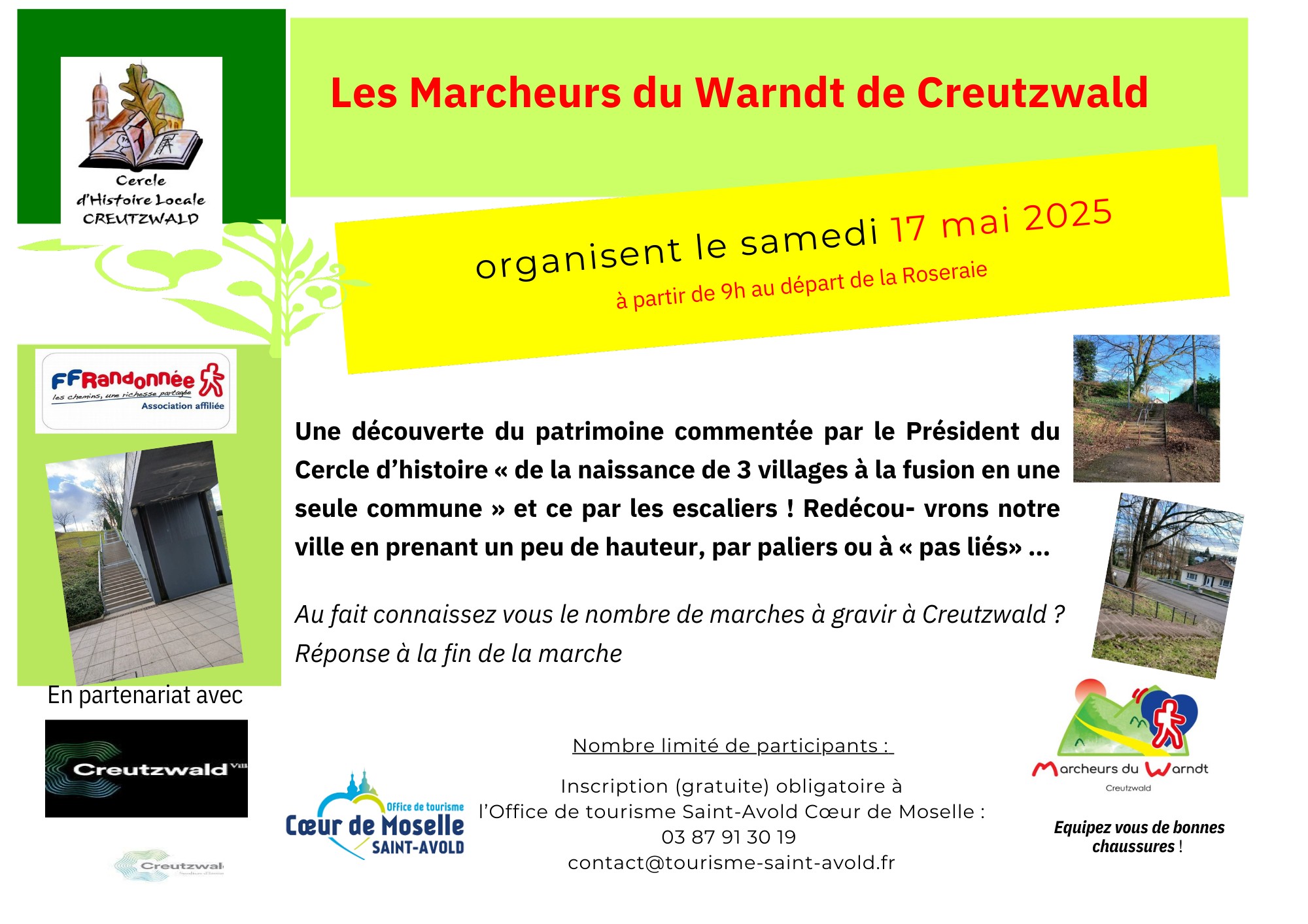 Marche découverte du patrimoine commentée Inscription gratuite et obligatoire à l’Office de tourisme. Nombre limité de participants. + Ajouter à mon Agenda Google + iCal / Outlook export Date 17 Mai 2025 Expiré! Heure 9 h 00 min Lieu Le parking de la Roseraie, à proximité du plan d'eau Creutzwald (57150) Organisateur Les Marcheurs du Warndt de Creutzwald Partagez cet événement