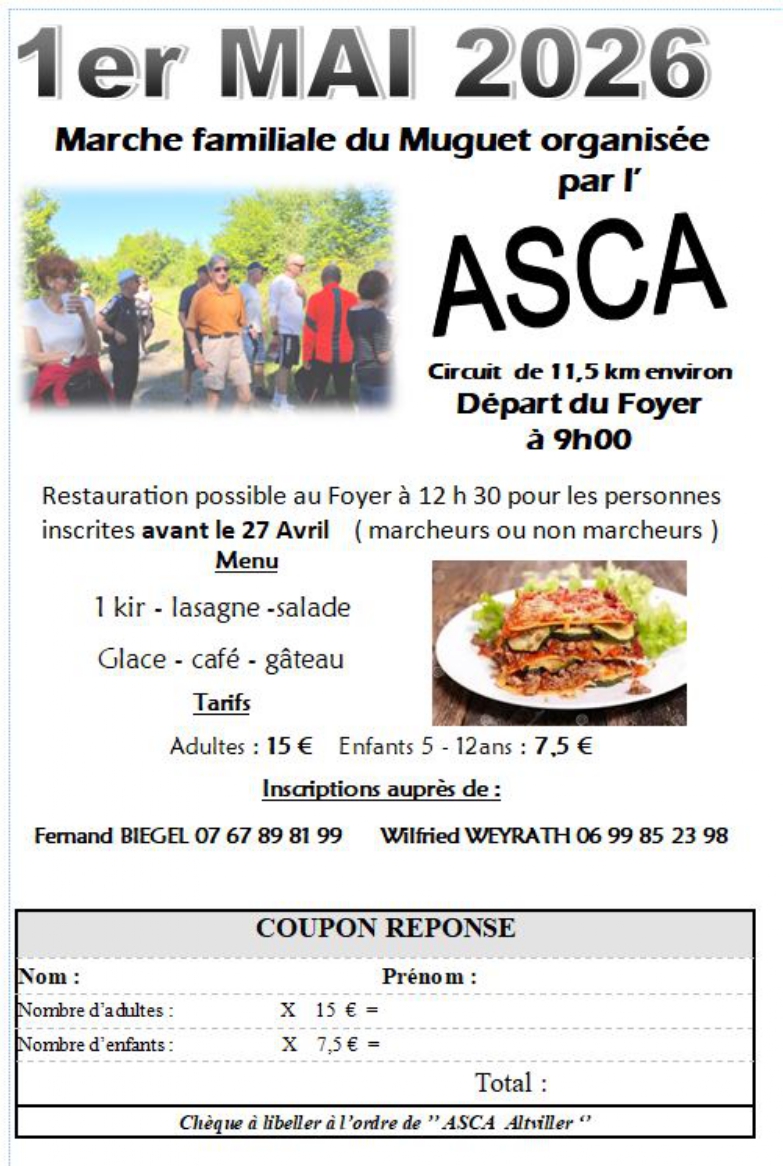 Marche du muguet (11,5 km) Tarifs : 15€/adulte, 7,5€/enfant (5-12 ans). Inscription au 07 67 89 81 99. + Ajouter à mon Agenda Google + iCal / Outlook export Date 01 Mai 2026 Heure 9 h 00 min Lieu Foyer d'Altviller 57015 Organisateur Association Socio-Culturelle d'Altviller Téléphone 06 99 85 23 98 Partagez cet événement