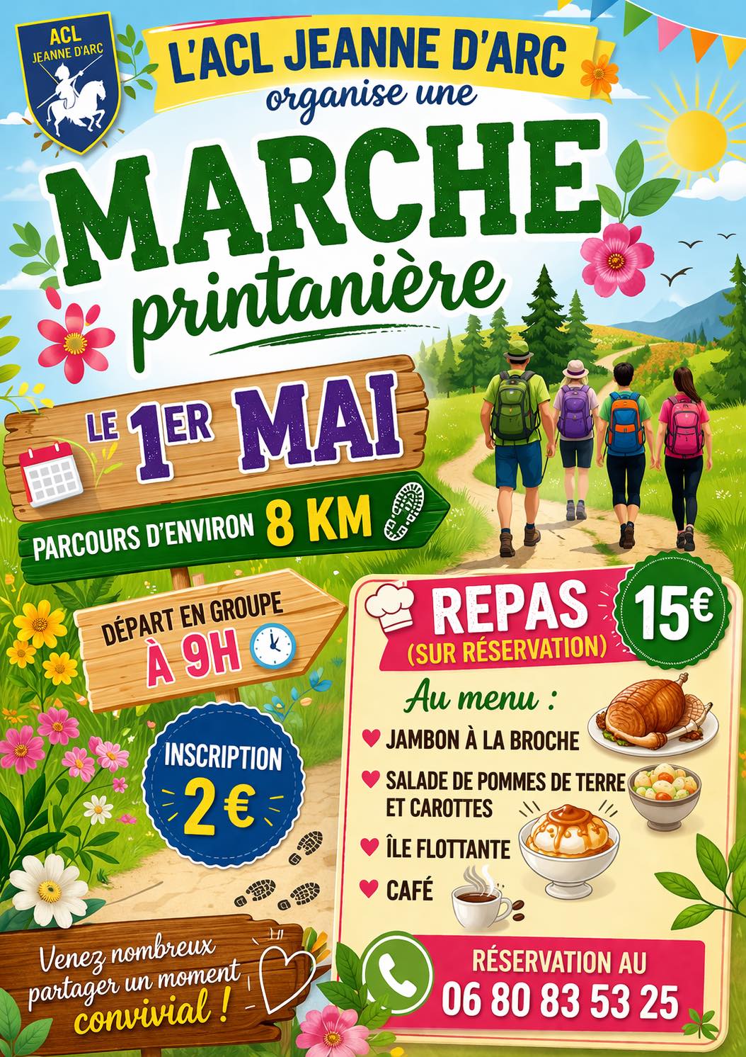 Marche printanière (8 km) Inscription à 2€. Repas sur réservation à 15€ au 06 80 83 53 25. + Ajouter à mon Agenda Google + iCal / Outlook export Date 01 Mai 2026 Heure 9 h 00 min Lieu Centre socio-culturel de Jeanne d’Arc Organisateur ACL Jeanne d'Arc Saint-Avold Téléphone 06 80 83 53 25 Partagez cet événement