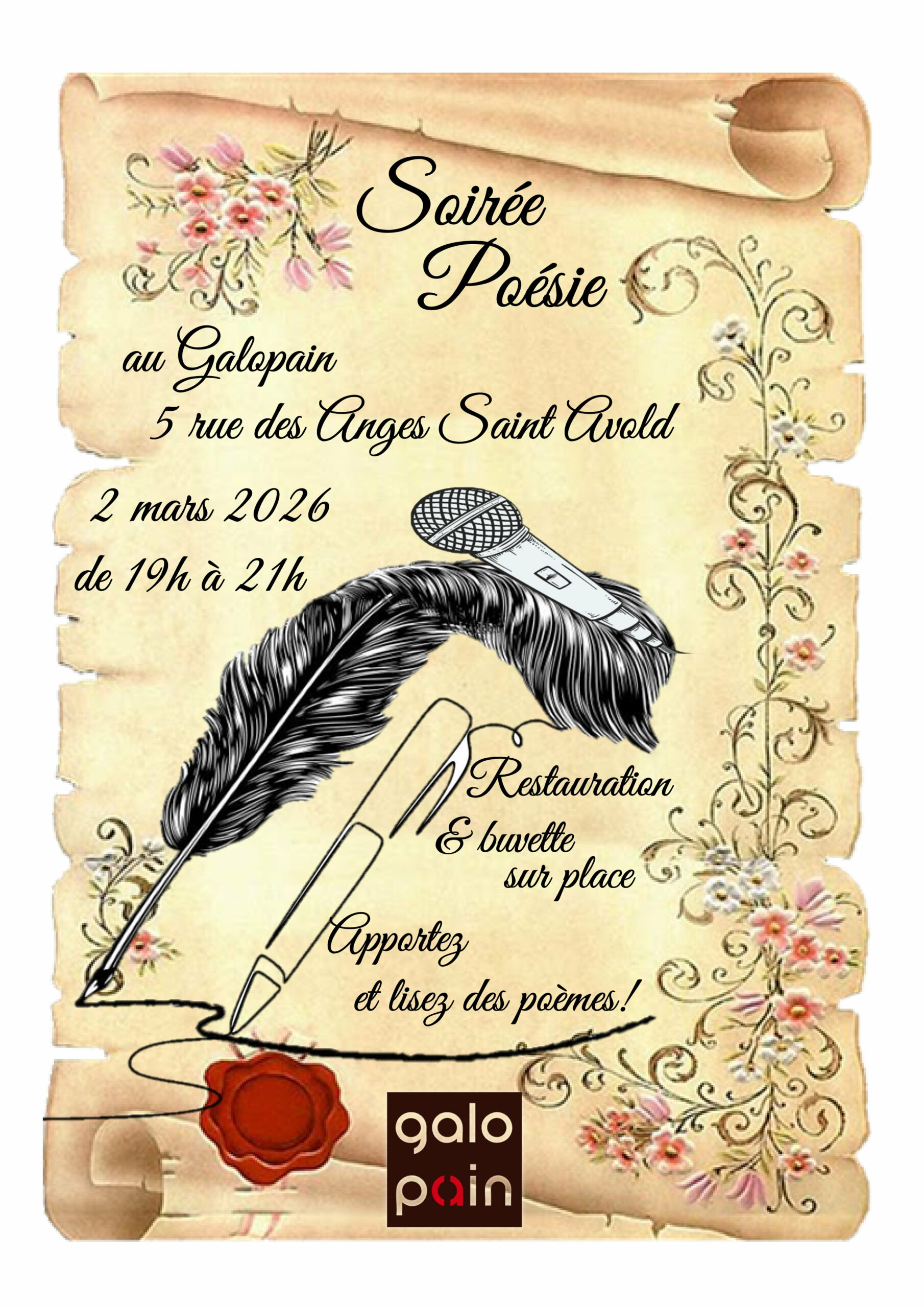 Soirée poésie « Apportez et lisez vos poèmes! ». Restauration et buvette sur place. Animé par Denis Koch. + Ajouter à mon Agenda Google + iCal / Outlook export Date 02 Mar 2026 Heure 19 h 00 min - 21 h 00 min Lieu Galopain 5 rue des Anges 57500 SAINT-AVOLD Partagez cet événement