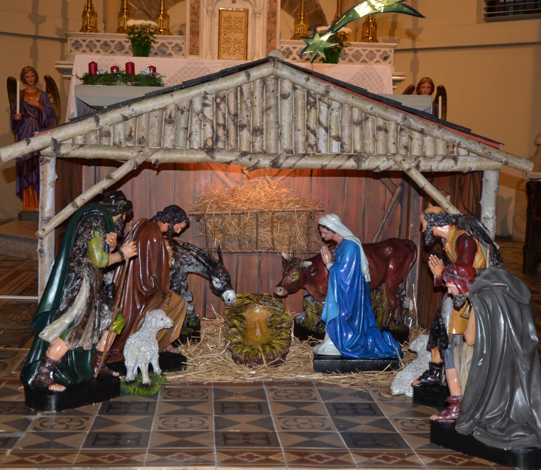 La crèche extérieure illuminée la nuit est visible à tout moment du 06/12 au 15/01/2026 devant l’église.