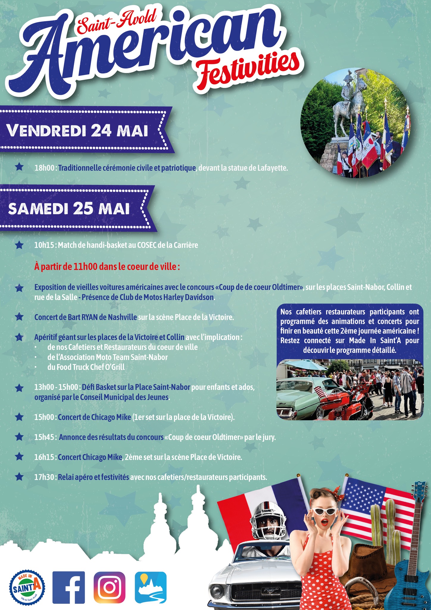 À 10h30 – Exposition de vieilles voitures américaines avec le concours ” Coup de coeur Oldtimer” sur les places St-Nabor, Collin et rue de la Salle – Présence de Club de Motos Harley Davidson.