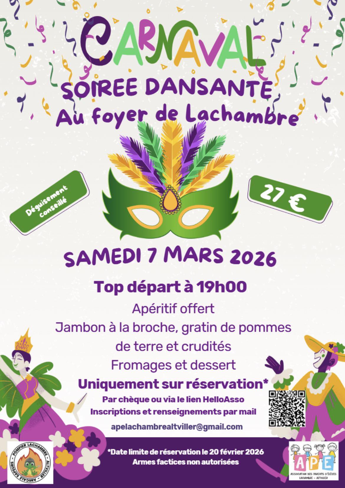 Soirée dansante Tarif : 27€. Sur réservation uniquement sur https://www.helloasso.com/associations/ape-lachambre-altviller/evenements/carnaval-1 + Ajouter à mon Agenda Google + iCal / Outlook export Date 07 Mar 2026 Heure 19 h 00 min Lieu Foyer communal de Lachambre 21 Rue Principale, 57730 Lachambre Organisateur l'APE Lachambre-Altviller Partagez cet événement
