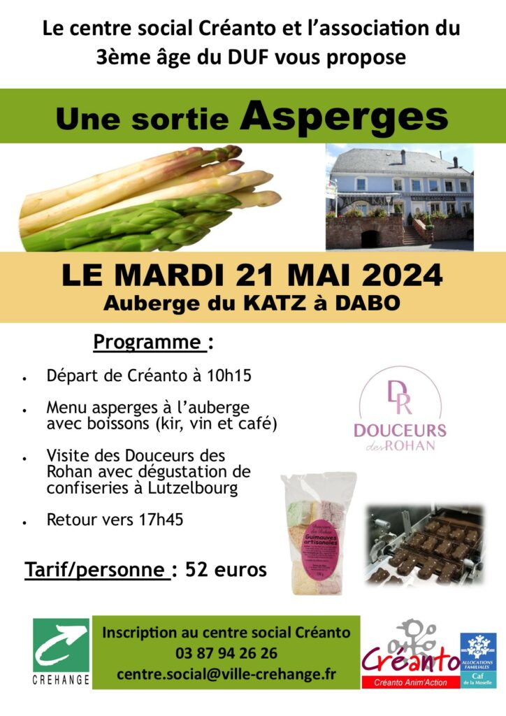 Sortie asperges à Dabo + Ajouter à mon Agenda Google + iCal / Outlook export Date 21 Mai 2024 Expiré! Heure 10 h 15 min - 17 h 45 min Tarif 52.00€ Lieu Centre social Créanto 4 rue de Metz, 57690 CRÉHANGE Partagez cet événement