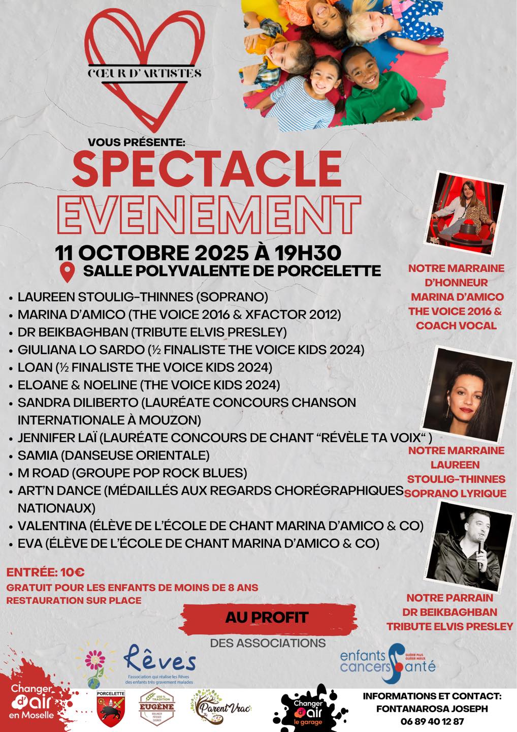 Spectacle Organisé par l’Association Coeur d’artistes. Au profit de l’Association de “Rêves et Enfants cancers santé”. Restauration sur place Tarif : 10€, gratuit enfant – de 13 ans. + Add to Google Calendar + iCal / Outlook export Date 11 Oct 2025 Expired! Time 19 h 30 min Location Salle polyvalente – Porcelette (57890) Organizer Uncategorized Share this event