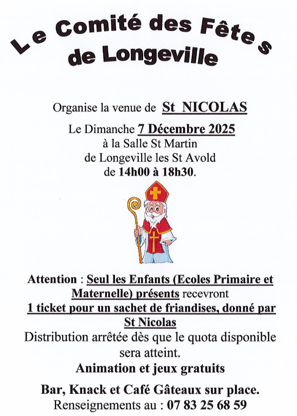St-Nicolas Priorité aux élèves de Longeville Tarif : 2€/écolier. Petite restauration sur place. + Ajouter à mon Agenda Google + iCal / Outlook export Date 07 Déc 2025 Heure 14 h 30 min - 18 h 30 min Lieu Salle Saint-Martin Longeville-lès-Saint-Avold Organisateur Le Comité des fêtes de Longeville-lès-Saint-Avold Partagez cet événement