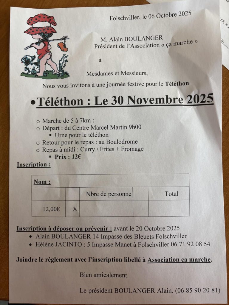 Téléthon Folschviller : marche (5-7 km) + Add to Google Calendar + iCal / Outlook export Date 30 Nov 2025 Expired! Time 9 h 00 min Location Centre Marcel Martin Organizer ça marche Share this event