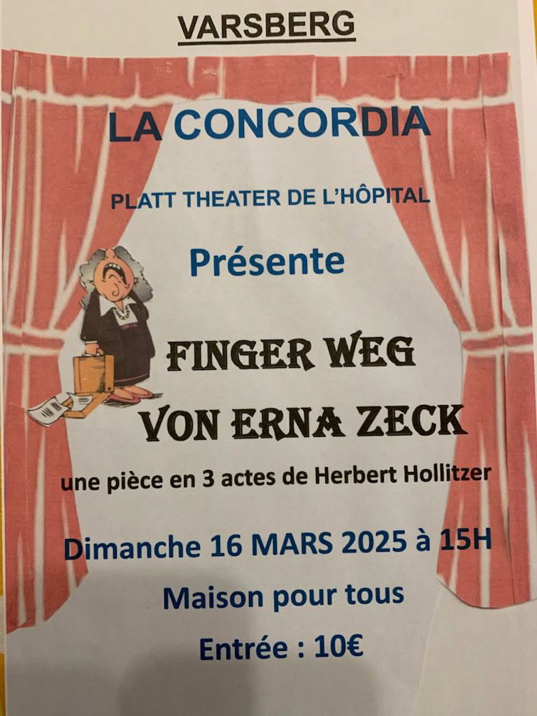 Théâtre en platt : « Finger weg von erna zeck » Une pièce en 3 actes de Herbert Hollitzer. Entrée : 10€. + Ajouter à mon Agenda Google + iCal / Outlook export Date 15 Mar 2025 Expiré! Heure 15 h 00 min Lieu Maison pour tous de Varsberg 2 Rue du Cimetière - Varsberg (57880 ) Organisateur Les Aiguilles d'or de VARSBERG Partagez cet événement