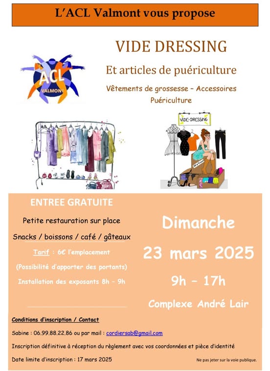 Vide dressing et articles de puériculture + Ajouter à mon Agenda Google + iCal / Outlook export Date 23 Mar 2025 Expiré! Heure 9 h 00 min - 17 h 00 min Lieu Salle polyvalente André Lair Valmont (57730) Organisateur ACL Valmont Site Web https://www.facebook.com/p/ACL-Valmont-100034621586178/?locale=fr_FR Partagez cet événement