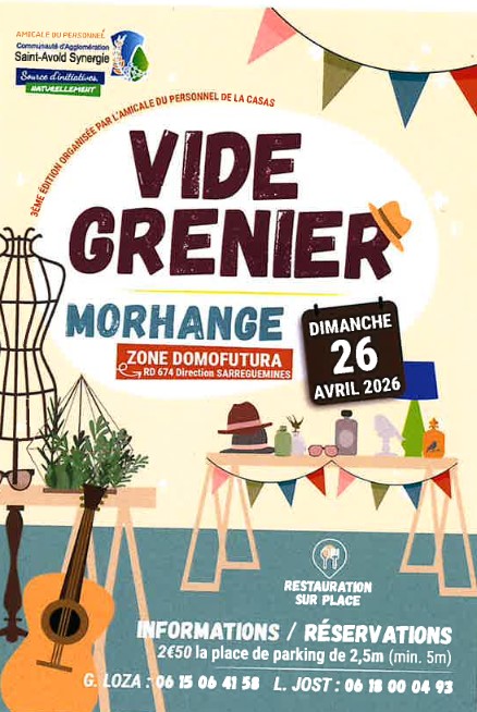 Vide grenier + Ajouter à mon Agenda Google + iCal / Outlook export Date 26 Avr 2026 Chargement... Lieu Zone Domofutura MORHANGE RD 674 Direction Sarreguemines Organisateur Amicale du personnel de la CASAS Partagez cet événement