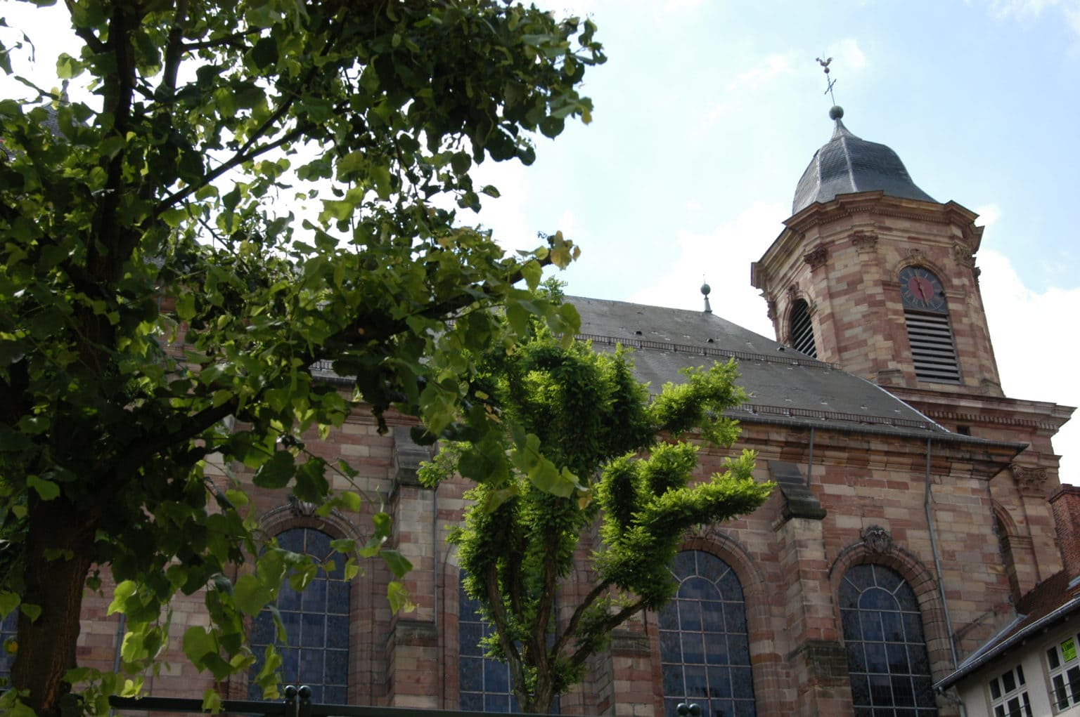 Les bulbes couverts d’ardoise qui coiffent les trois tours de l’église confèrent à l’abbatiale un aspect baroque et pourtant l’architecture de l’édifice est classique. C’est le mariage entre le plan médiéval d’une ÉGLISE-HALLE (les trois nefs d’égale hauteur) et le goût marqué du siècle des lumières pour la clarté que lui donnent les grandes baies vitrées. La tour-clocher culmine à 45 mètres. L’Abbatiale est un peu l’image-symbole de la ville.