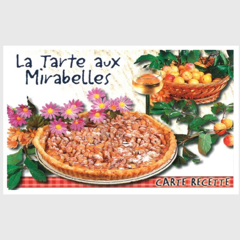 Carte postale recette de cuisine : la tarte aux mirabelles. Au verso, la recette complète.