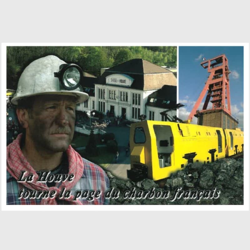 Carte postale représentant le siège de la Houve à Creutzwald, un mineur, un train de la mine et un chevalement.